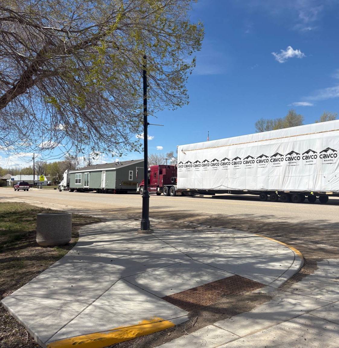 Our house arrived on Sunday, April12th. The Wyoming Wind presented challenges in the travels, and it arrived a day later than scheduled. This pic is of it sitting on the main street when they pulled into town.